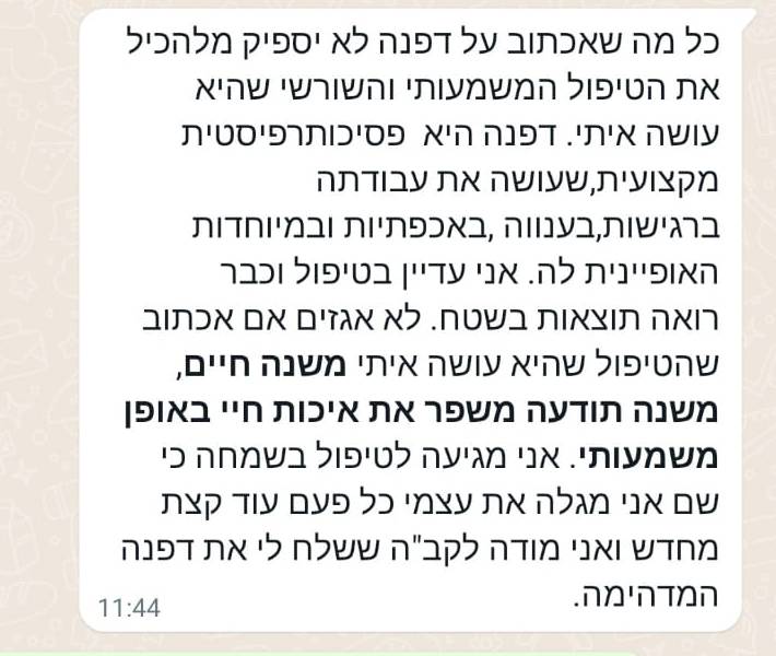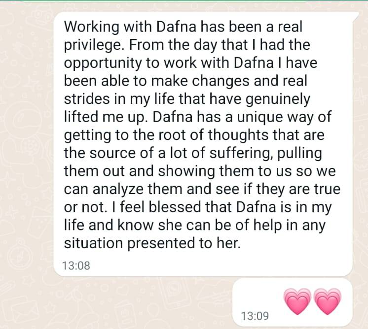 בזמן משבר אישי שעברתי, דפנה ליוותה אותי ברגישות רבה, והעניקה לי כלים מעשיים שהיו לי לעזר של ממש. הניסיון האישי שלי ממחיש עד כמה היא מקצועית, נבונה ומכילה.