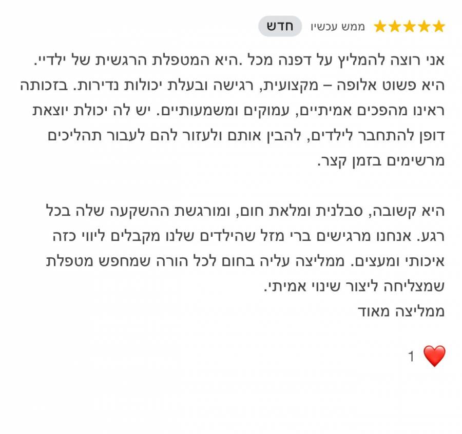 אני ממליצה עליה בחום רב לכל מי שמחפש מטפלת מיומנת, אנושית ומקצועית באמת.