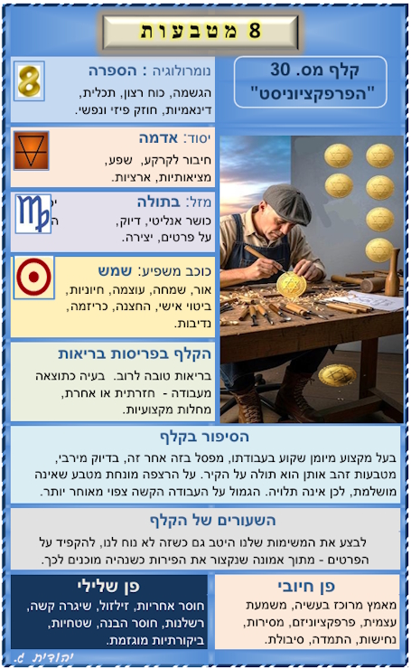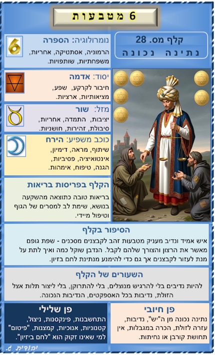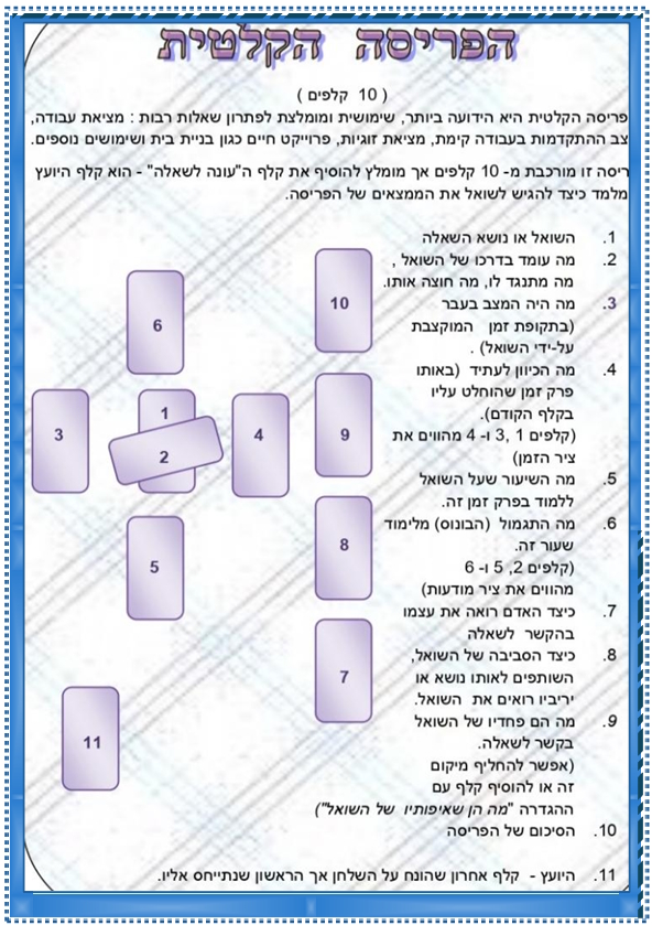 - 5 קלפים עם פריסות מומלצות לביצוע בנושאים המבוקשים ביותר: בריאות, פרנסה, מערכות יחסים וקבלת החלטות.